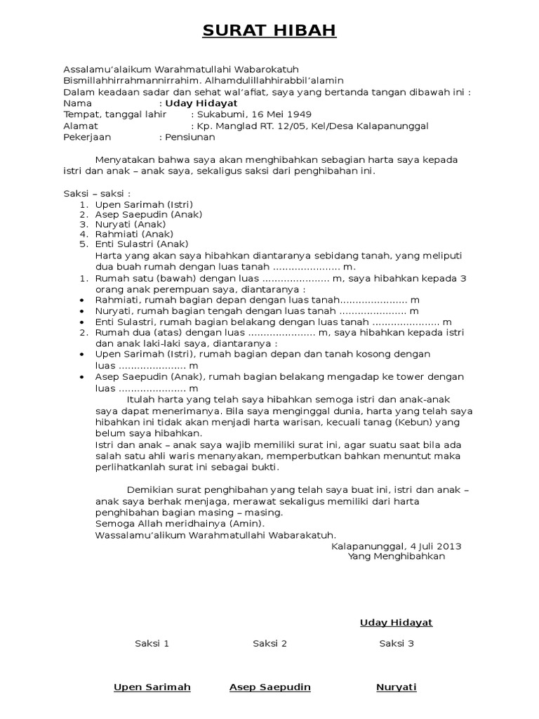 Siti robiah tempat /tgl lahir : Jakarta selatan, 22 september dengan datangnya surat ini, kami selaku orang tua memberikan izin kepada anak kami untuk bergabung di klub motor yamaha selalu didepan untuk cabang malang. Surat pernyataan hibah tanah pada dasarnya menyatakan bahwa tanah yang anda punya sekarang merupakan hasil hibah atau bisa juga dalam kondisi anda menghibahkan tanah milik anda kepada orang lain. Surat hibah tanah adalah sautu surat yang mana menjadi bukti otentik bahwa seseorang telah memberikan (menghibahkan) sebagian tanah miliknya kepada orang lain dimana orang yang memberi serta yang menerima masih hidup. Contoh surat perjanjian jual beli tanah.